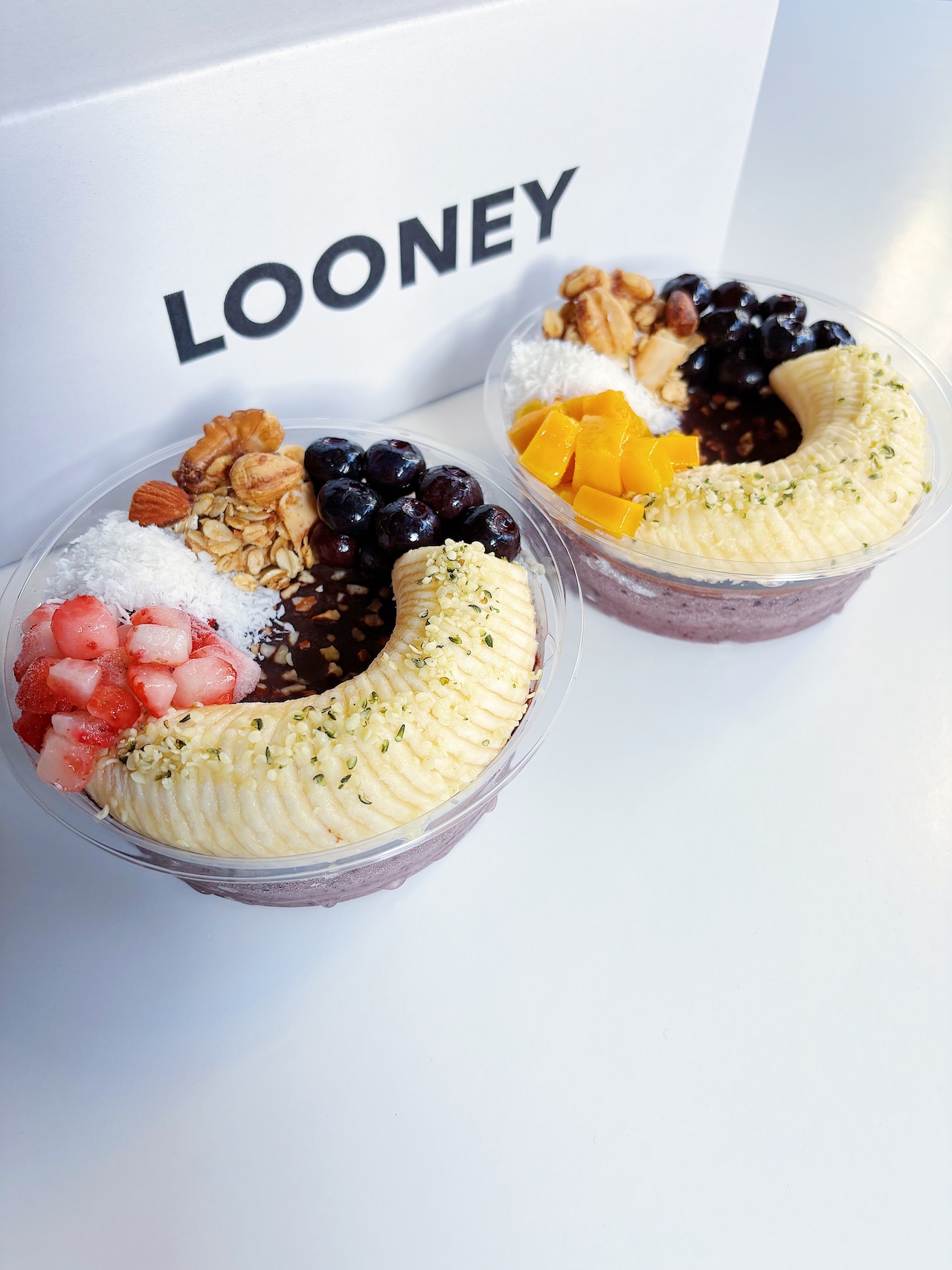 バナナ、ブルーベリー、有機アサイーパウダー、有機マキベリーパウダー、いちご、マンゴー、有機ココナッツオイル、有機メープルシロップ、有機ココアパウダー、有機ココナッツクリーム、有機ヘンプシードナッツ