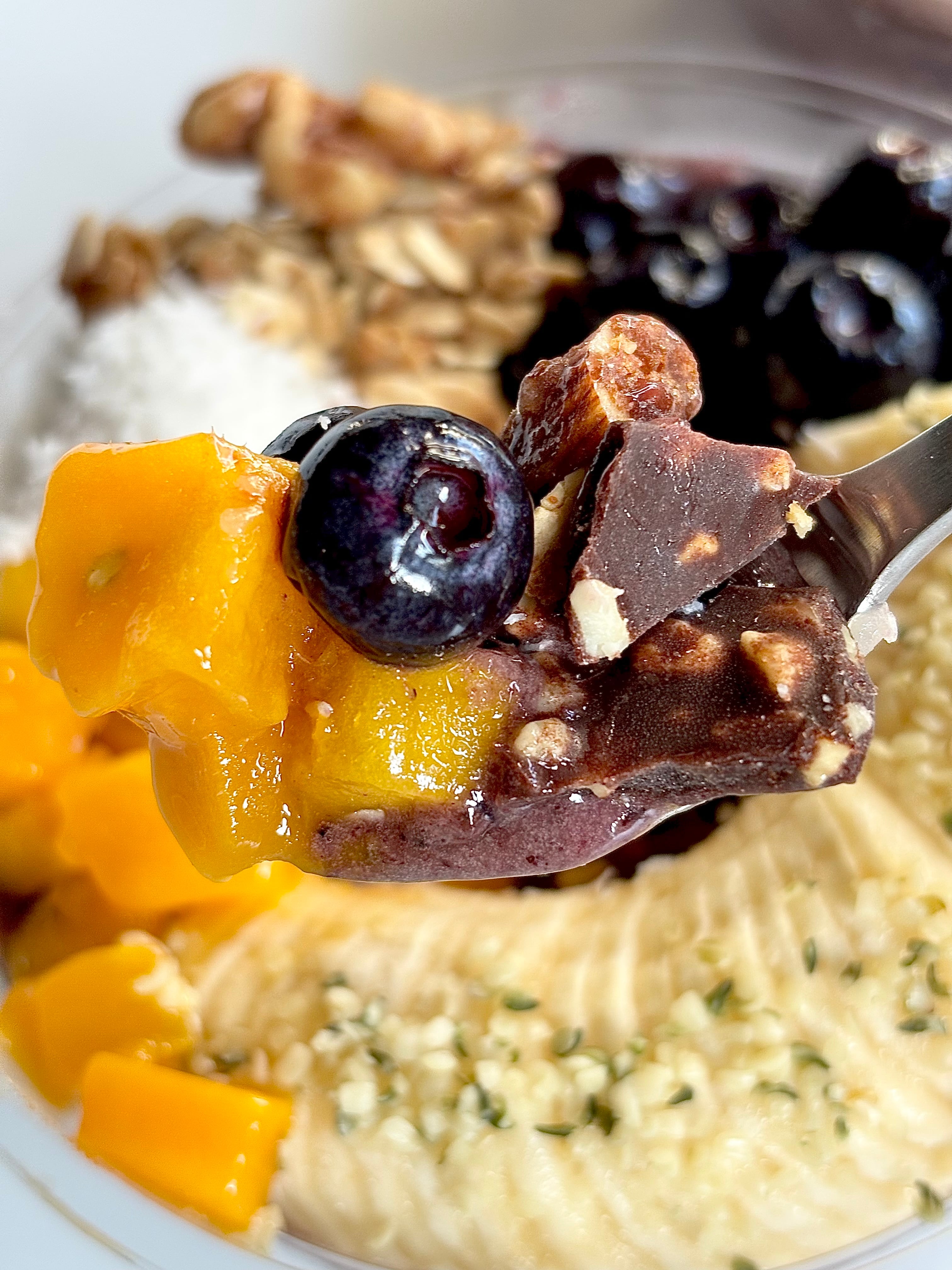 大人気のアサイーボウルにヴィーガンチョコレートを加えたクラッキングアサイーボウル。